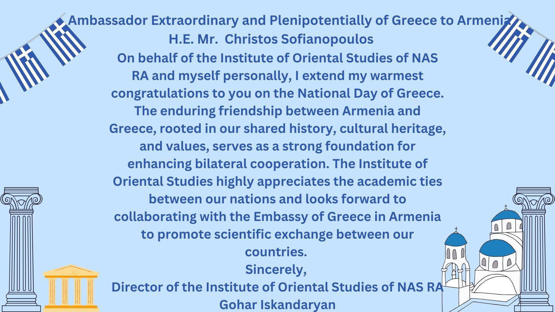 On behalf of the Institute of Oriental Studies of NAS RA and myself personally, I extend my warmest congratulations to you on the National Day of Greece. The enduring friendship between Armenia and Greece, rooted in our shared history, cultural heritage, and values, serves as a strong foundation for enhancing bilateral cooperation. The Institute of Oriental Studies highly appreciates the academic ties between our nations and looks forward to collaborating with the Embassy of Greece in Armenia to promote scientific exchange between our countries.