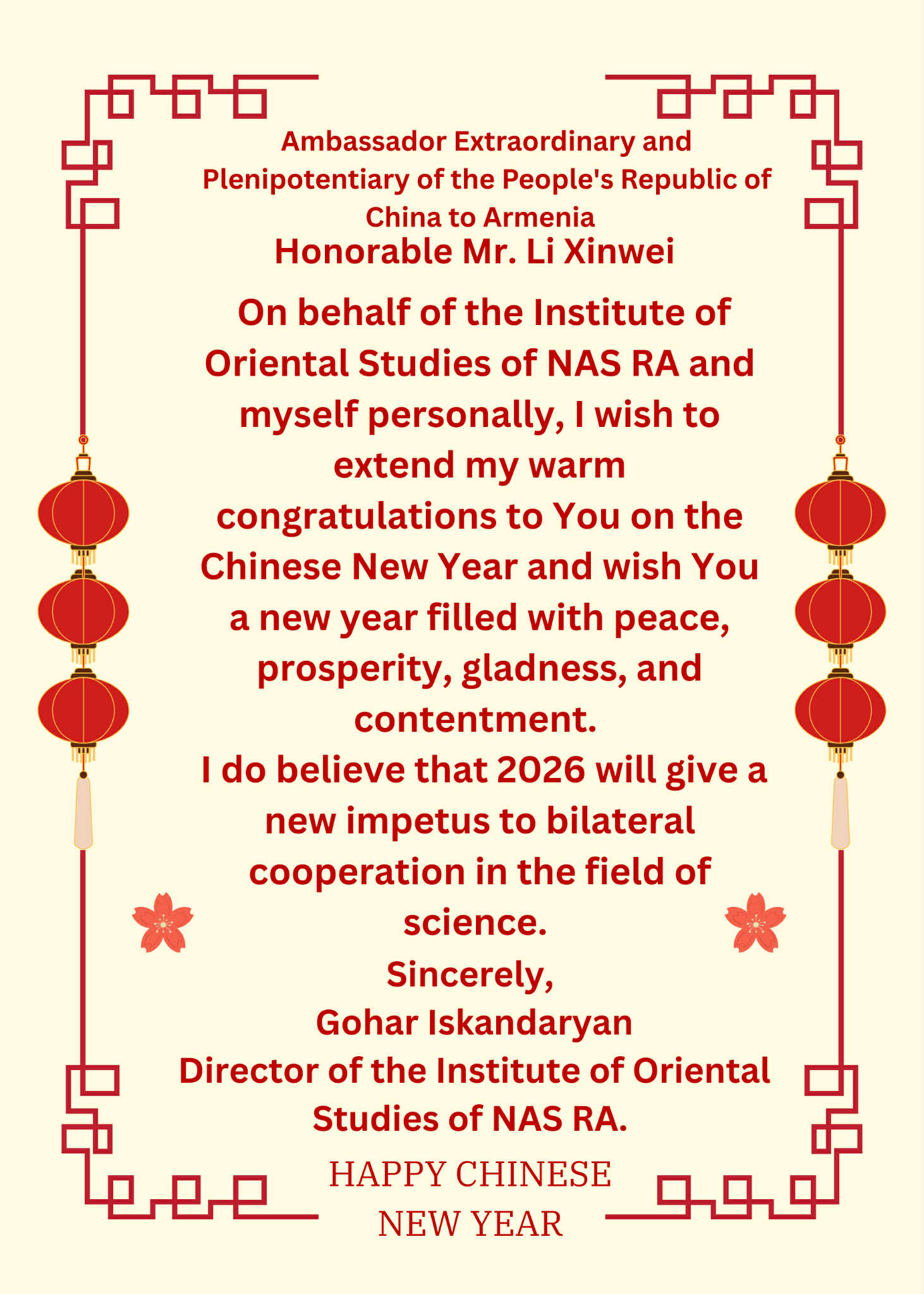 ՀՀ ԳԱԱ Արևելագիտության ինստիտուտը շնորհավորում է Հայաստանի Հանրապետությունում Չինաստանի Ժողովրդական Հանրապետության արտակարգ և լիազոր դեսպան Լի Սինվեյին, չին գործընկերներին, Չինաստանի ժողովրդին՝ Նոր տարվա առթիվ, մաղթում բարգավաճում և խաղաղություն։ Արևելագիտության ինստիտուտը լիահույս է, որ Հայաստան- Չինաստան գիտական համագործակցությունը, բազմակողմ փոխգործակցությունը և ժողովուրդների միջև կապերը առաջիկայում էլ ավելի են ընդլայնվելու և խորանալու։