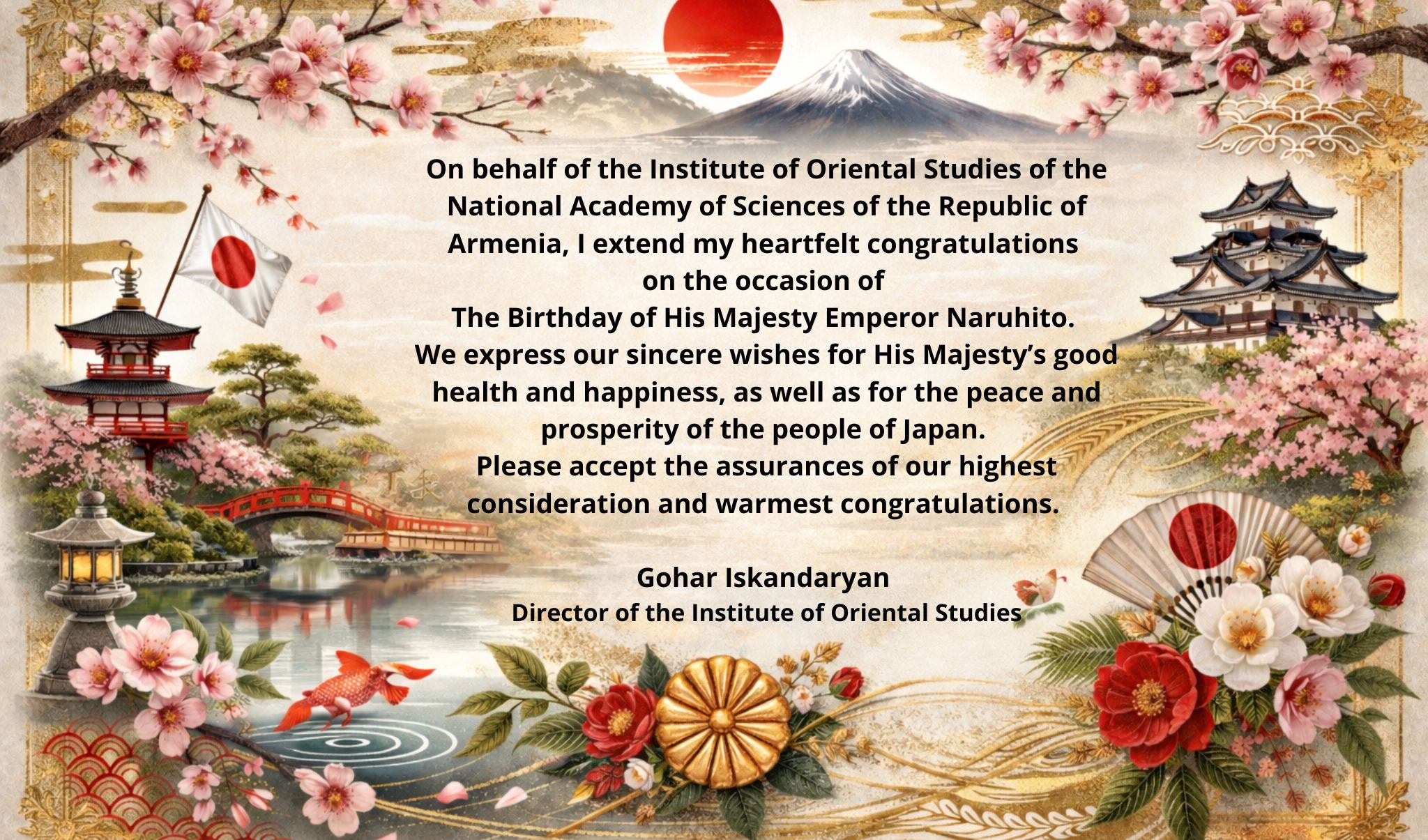 ՀՀ ԳԱԱ Արևելագիտության ինստիտուտը ջերմորեն շնորհավորում է Հայաստանի Հանրապետությունում Ճապոնիայի արտակարգ և լիազոր դեսպան Աոկի Յուտակային, Ճապոնիայի դեսպանատանը, ինչպես նաև բարեկամ ճապոնական ժողովրդին՝ Ճապոնիայի ազգային տոնի՝ կայսեր ծննդյան օրվա առթիվ՝ մաղթելով խաղաղություն, բարօրություն և շարունակական զարգացում։ Արևելագիտության ինստիտուտը լիահույս է, որ Հայաստանի և Ճապոնիայի միջև ձևավորված երկկողմ համագործակցությունը, ինչպես նաև ժողովուրդների միջև բարեկամական կապերը, առաջիկայում ևս կշարունակեն ընդլայնվել և խորանալ՝ նպաստելով հարաբերությունների հետագա ամրապնդմանը։