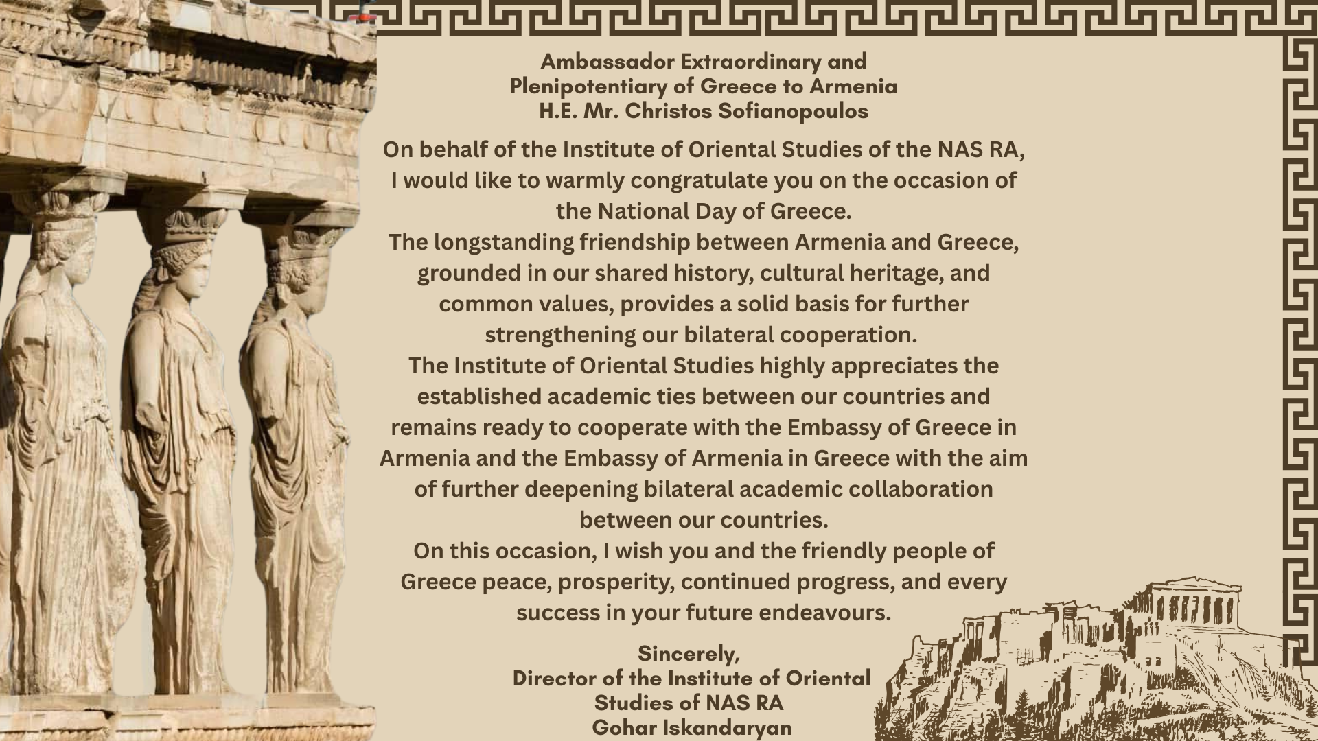 ՀՀ ԳԱԱ Արևելագիտության ինստիտուտը շնորհավորում է Հայաստանի Հանրապետությունում Հունաստանի Հանրապետության արտակարգ և լիազոր դեսպան, Ն.Գ. պարոն Խրիստոս Սոֆիանոպուլոսին Հունաստանի անկախության տոնի առթիվ՝ մաղթելով խաղաղություն, բարօրություն և շարունակական առաջընթաց: Հայաստանի և Հունաստանի միջև առկա բարեկամական կապերը, որոնք հիմնված են մեր ընդհանուր պատմամշակութային ժառանգության և արժեքների վրա՝ ամուր հիմք են հանդիսանում երկկողմ հարաբերությունների շարունակական զարգացման համար։ Արևելագիտության ինստիտուտը բարձր է գնահատում մեր երկրների միջև ձևավորված գիտական կապերը և մնում է պատրաստակամ Հայաստանում Հունաստանի և Հունաստանում Հայաստանի դեսպանությունների հետ համագործակցության համար՝ ի նպաստ երկկողմ գիտական համագործակցության խորացմանը։