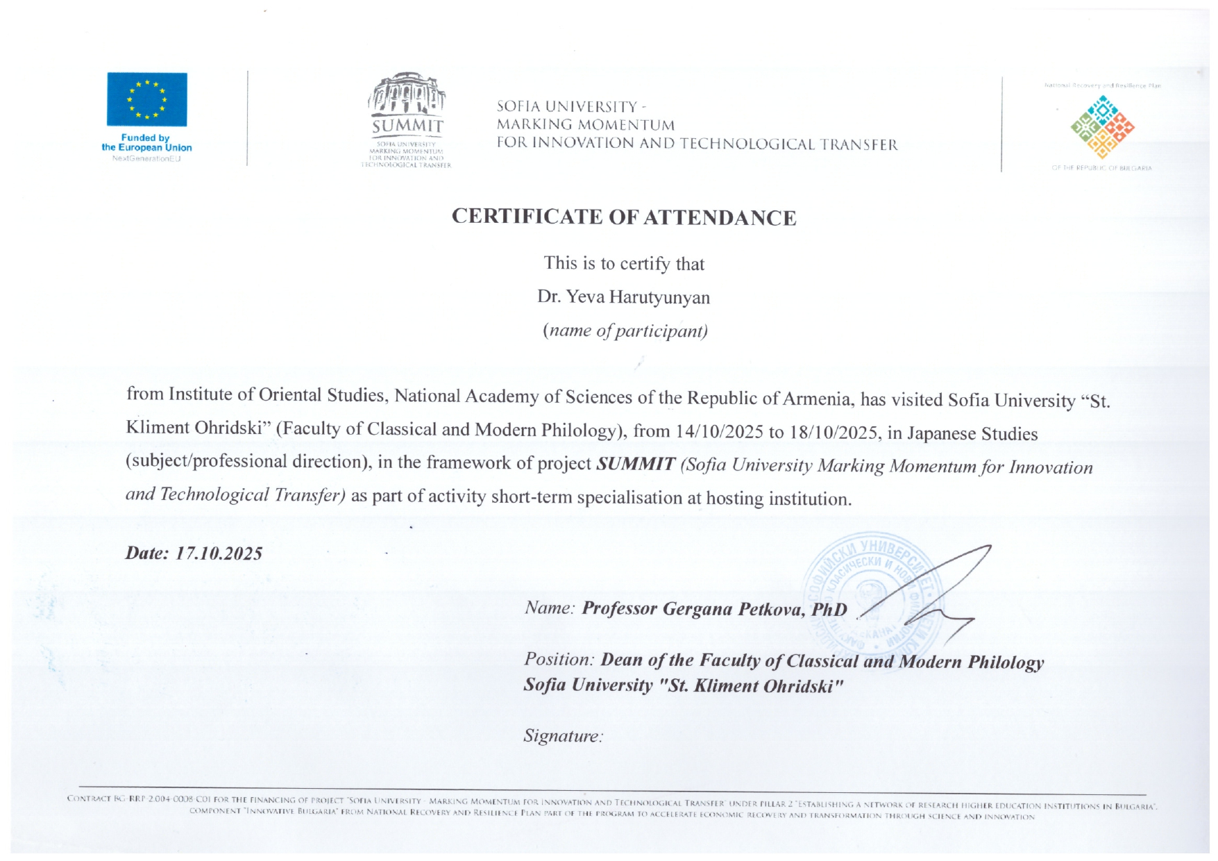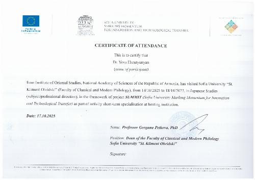 From October 14 to 18, 2025, Eva Harutyunyan, Secretary of Science and Japanologist at the Institute of Oriental Studies of NAS RA and PhD candidate, participated in the international conference dedicated to the 35th anniversary of the Department of Japanese Studies at the Faculty of Classical and Contemporary Philosophy, Sofia University “St. Kliment Ohridski.” The event, titled “Bulgarian Japanology in a Changing World: 35 Years of Japanese Studies at Sofia University,” brought together scholars from around the world to discuss developments in Japanese studies and contemporary research trends.