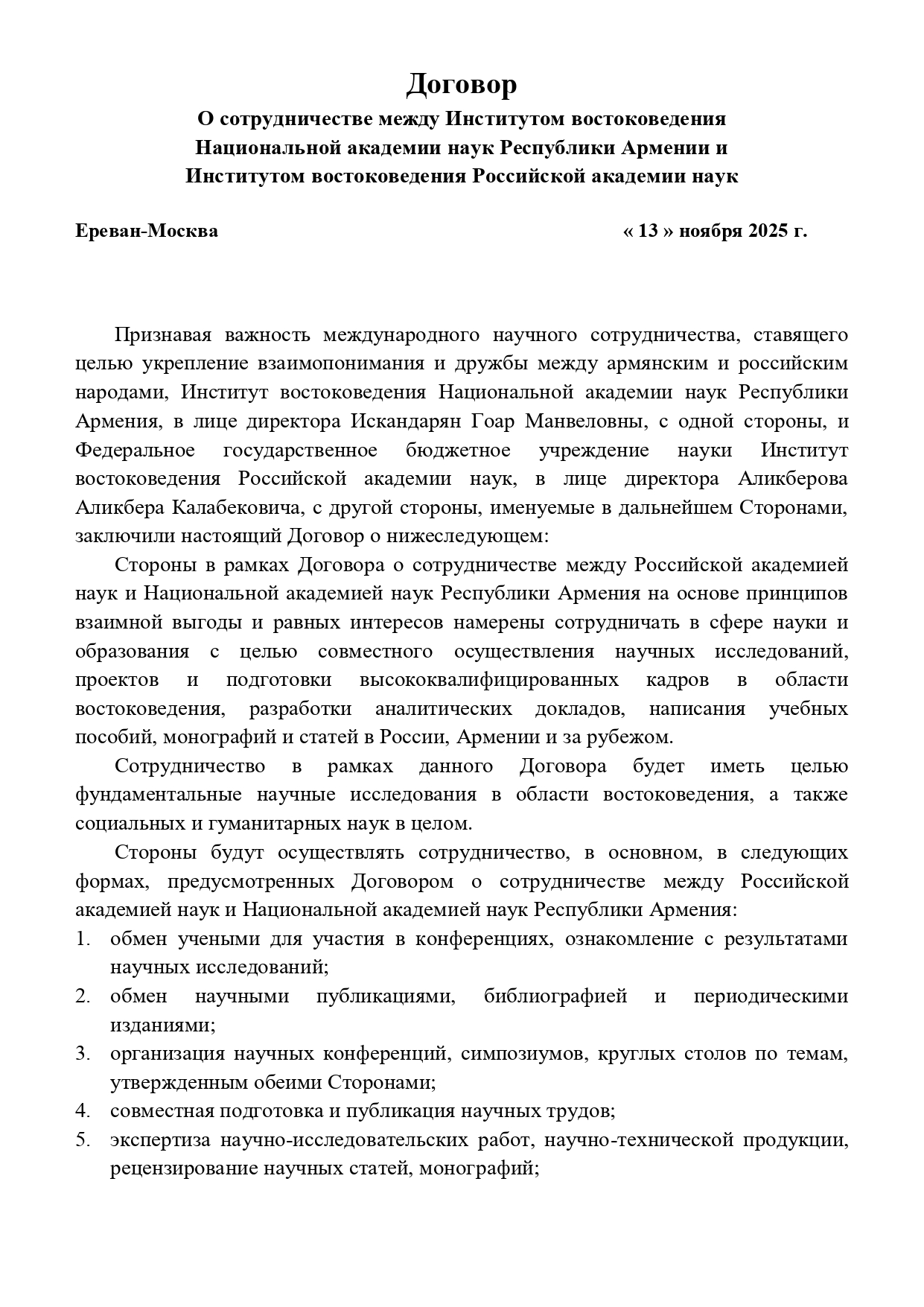 - Between the Institute of Oriental Studies of NAS RA and the Institute of Oriental Studies of RAS,