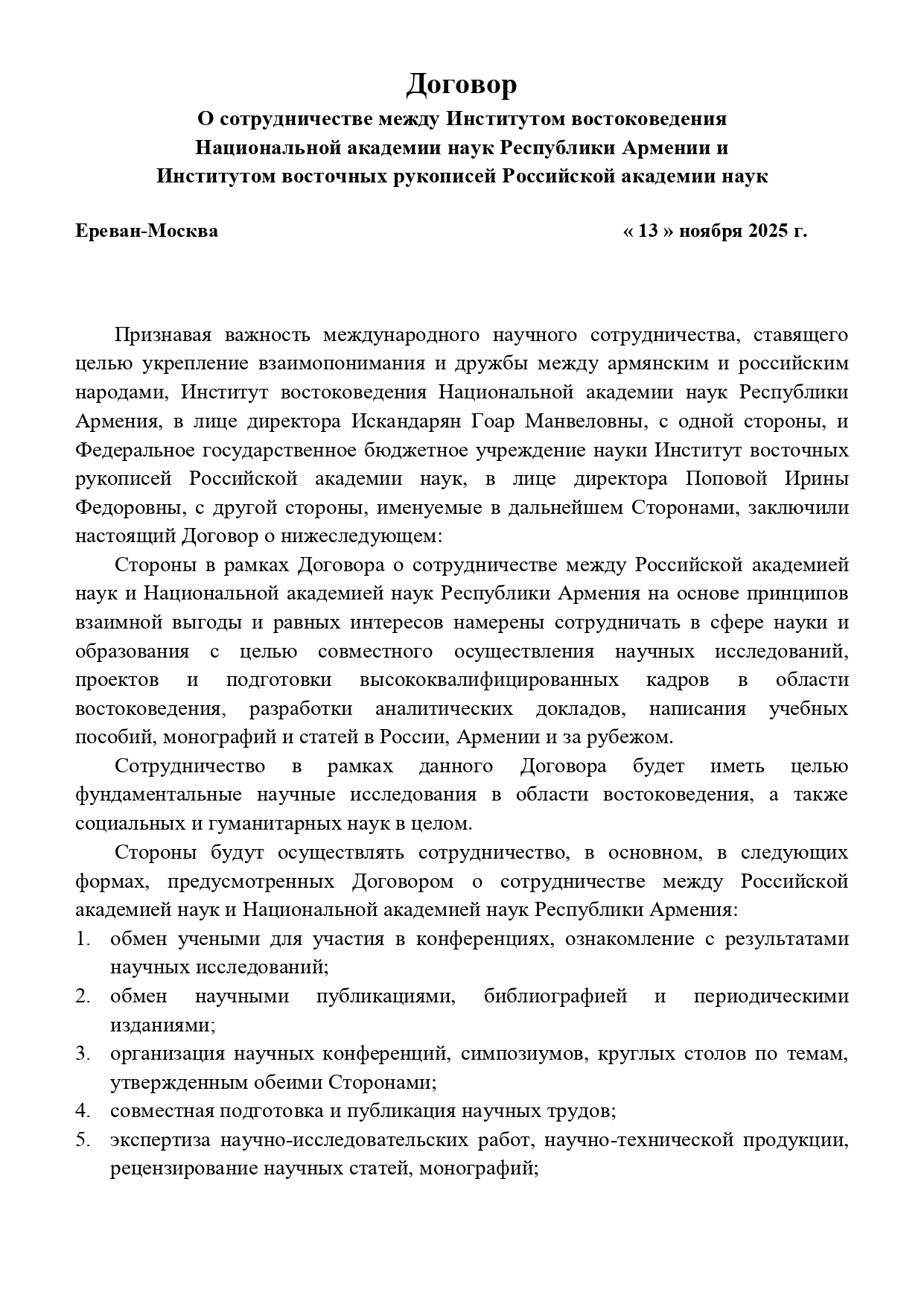 - Between the Institute of Oriental Studies of NAS RA and the Institute of Oriental Manuscripts of RAS.