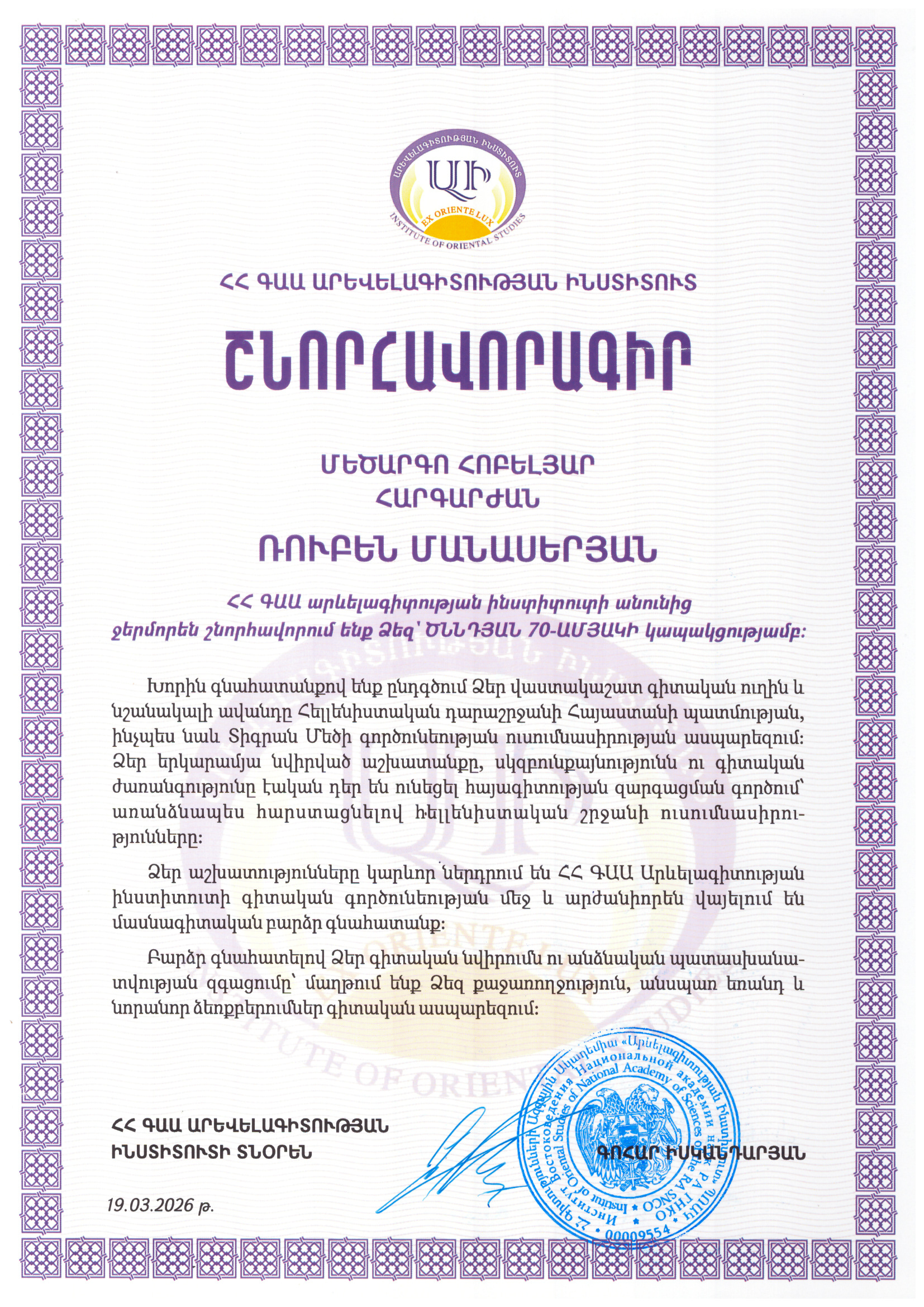 On April 19, 70th anniversary of Ruben Manaseryan was marked. He is a leading researcher at the Institute of Oriental Studies of the NAS RA, a distinguished scholar of Hellenistic-era Armenia, and Doctor of Historical Sciences.